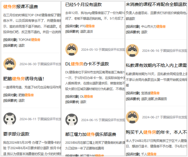 倒閉關(guān)門(mén)的健身房大多都逃不過(guò)資金鏈斷裂的問(wèn)題,黑貓投訴平臺(tái)上,關(guān)于健身房的投訴記錄超過(guò)5000條,幾乎每一條最終都指向了退款難題。