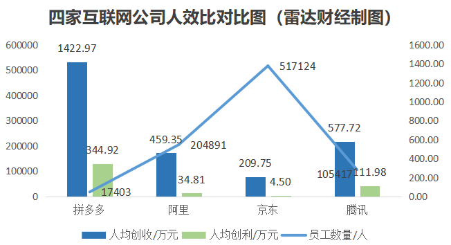 從人均創(chuàng)收指標(biāo)來看,拼多多是阿里的3.1倍、京東的6.78倍、騰訊的2.46倍;從人均創(chuàng)利指標(biāo)來看,拼多多是阿里的9.91倍、騰訊的3.08倍,更是京東的76.65倍。