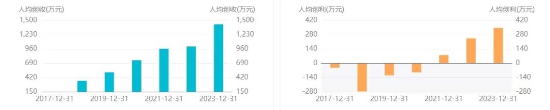 若按前述數(shù)據(jù)粗略計(jì)算,拼多多去年平均每個(gè)員工可以創(chuàng)造1422.97萬元的收入、344.92萬元的凈利潤。而將時(shí)間線進(jìn)一步拉長來看,自2018年起,拼多多的人均創(chuàng)收和人均創(chuàng)利指標(biāo)便呈現(xiàn)出逐年上升的趨勢。