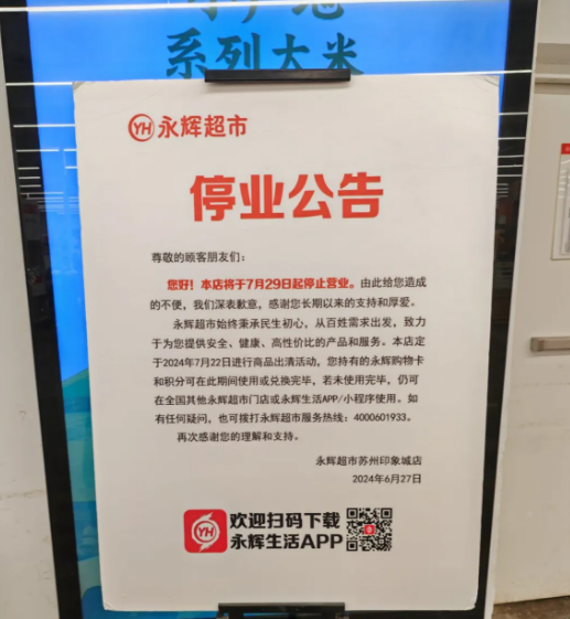 永輝超市蘇州印象城店宣布將于7月29日結(jié)束營業(yè)。
