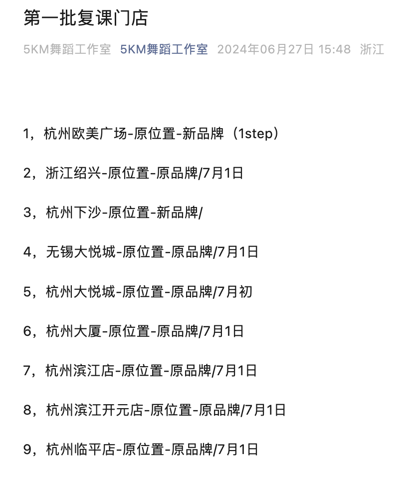 6月27日,5KM舞蹈工作室官方公眾號(hào)發(fā)布公告,宣布第一批復(fù)課門店在7月將于原址重開,共9家,其中兩家門店由新品牌接手。