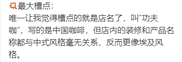 紅餐網(wǎng)翻閱社交媒體發(fā)現(xiàn),部分網(wǎng)友對(duì)于功夫咖給出了“不好喝”“空間設(shè)計(jì)不合理”“品牌定位混亂”等評(píng)價(jià)。甚至還有網(wǎng)友直言:“建議不要碰瓷中國咖啡”,說功夫咖雖定位“中國咖啡”,但門店修設(shè)計(jì)充滿了西方對(duì)東方的刻板印象,品牌概念浮于表面,難以被消費(fèi)者接納。