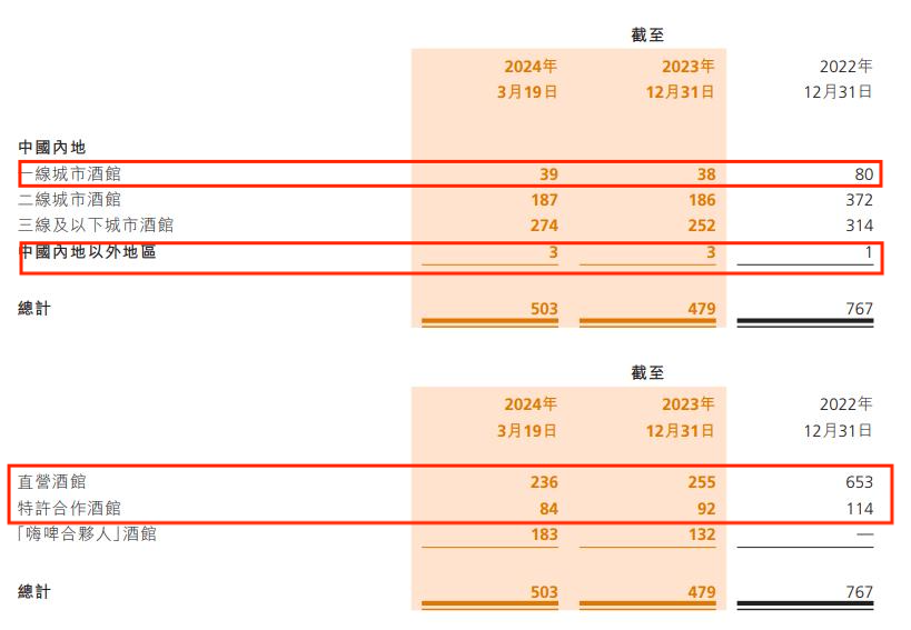 從上述門店數(shù)據(jù)不難看到,海倫司擁有總門店數(shù)為479家,比2022年減少了288家。而其中,從2022年末至今,海倫司的特許合作酒館關(guān)閉了30家,直營酒館關(guān)閉了417家。