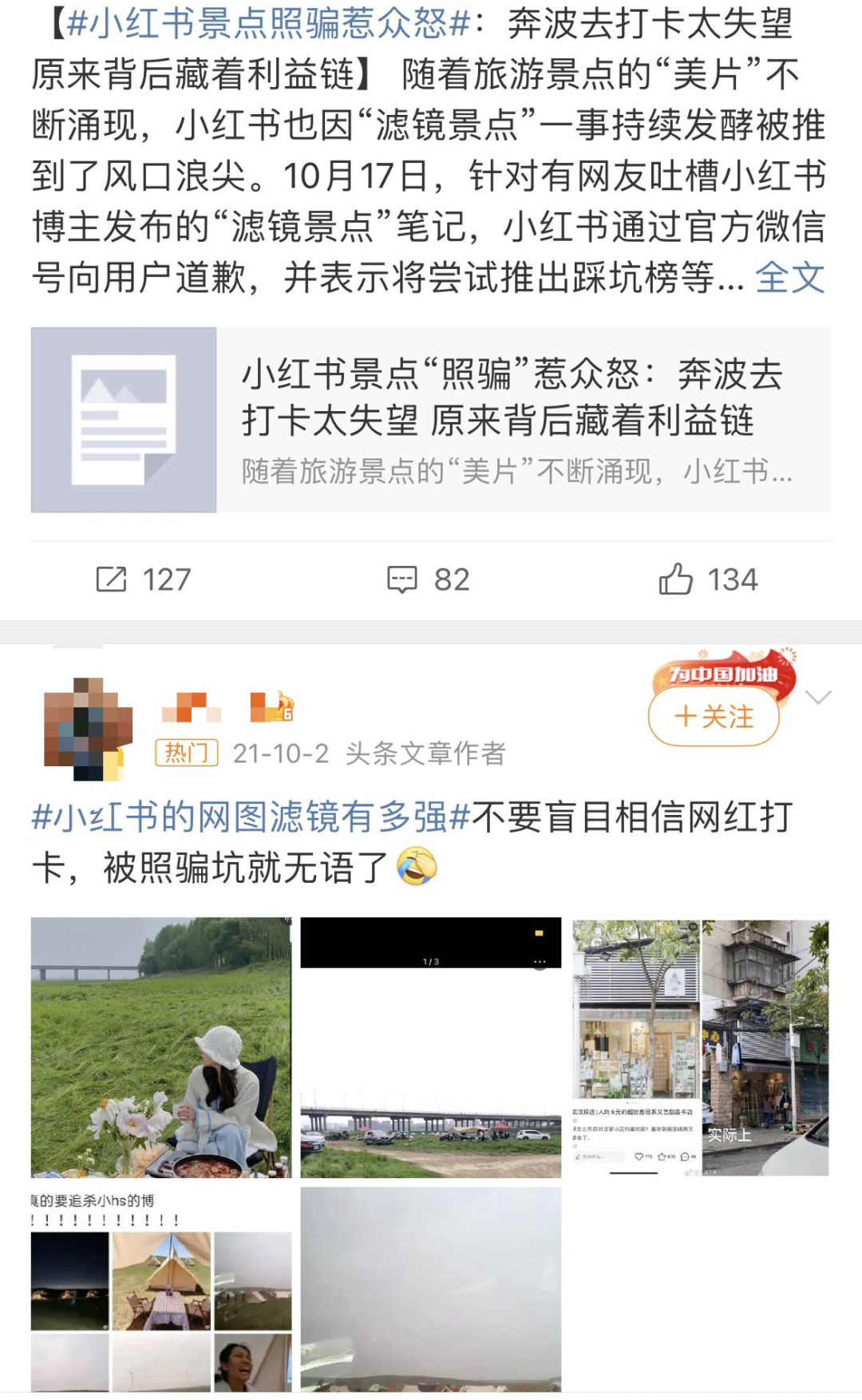 此外,從內(nèi)容角度來看,小紅書也有顧慮。多年前,小紅書就卷入“虛假濾鏡”的輿論風(fēng)波,有網(wǎng)友在小紅書博主的安利下打卡景點(diǎn),結(jié)果被“騙照”;此后不久,小紅書又因“代寫筆記、種草筆記造假”等問題登上微博熱搜,再度引發(fā)網(wǎng)友熱議。