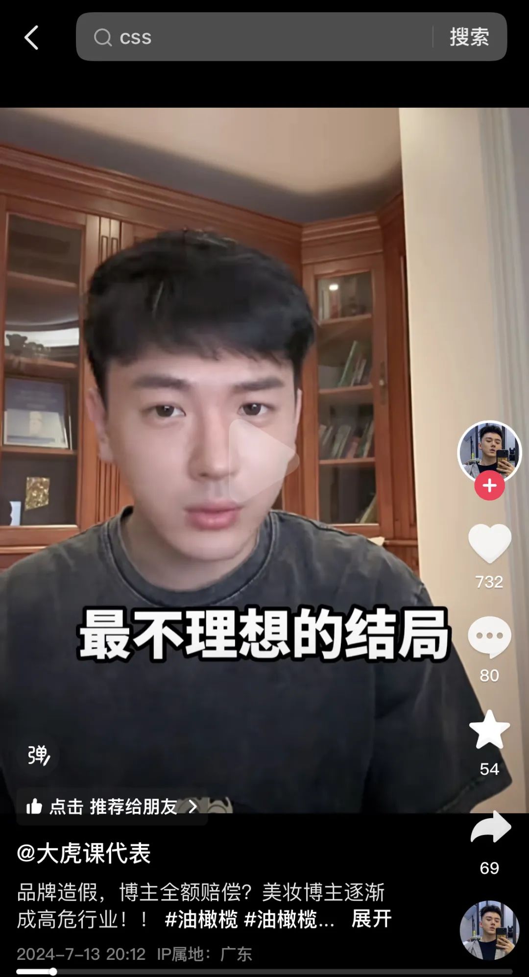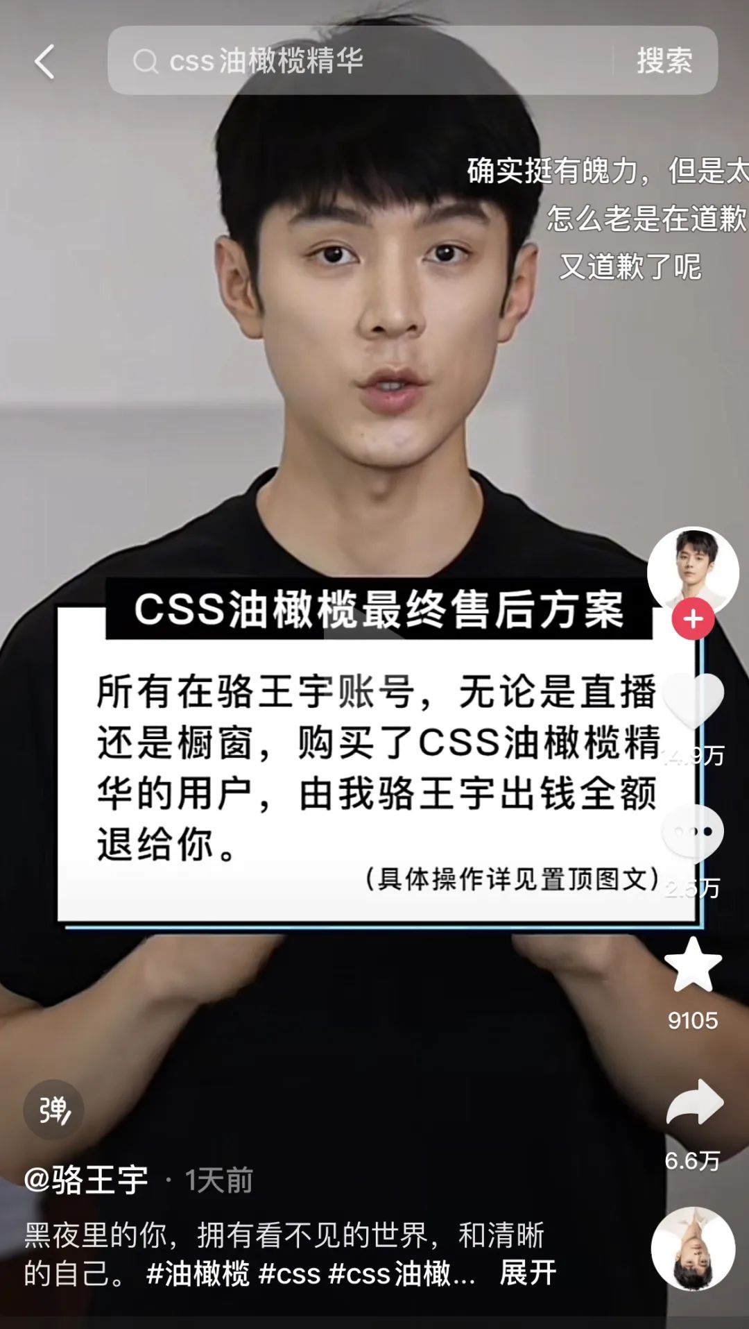 7月12日,駱王宇在抖音、小紅書等平臺(tái)發(fā)布視頻,稱將履行退款諾言,并透露“這個(gè)產(chǎn)品(CSS油橄欖精華)光我們這里就賣了1.5億元”。此外,駱王宇還表示油橄欖精華事件使其精疲力盡,“所以決定離開一段時(shí)間”,疑傳達(dá)出退隱之意。