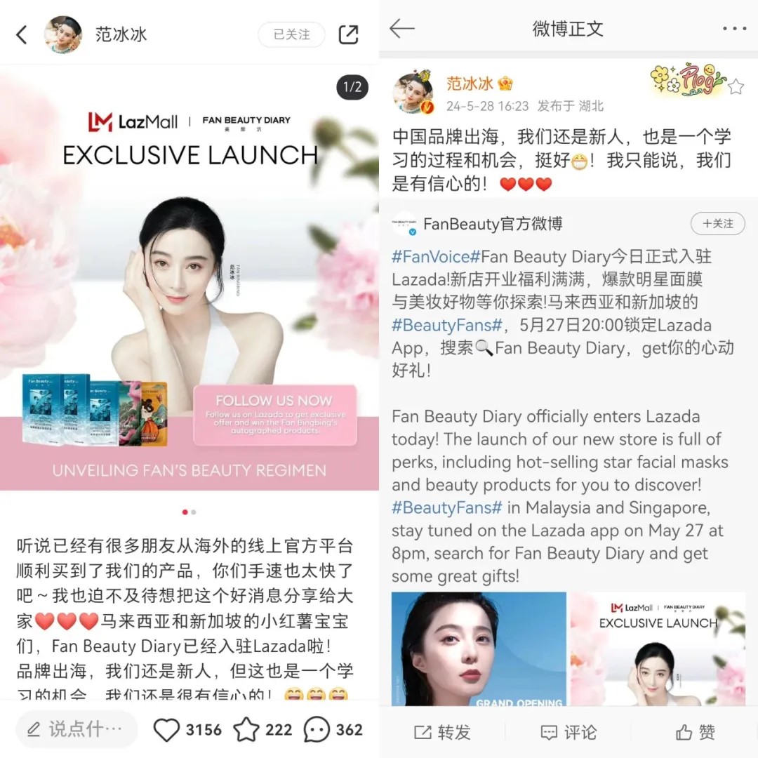 最能佐證范冰冰計劃在東南亞市場布局的,還是今年5月底,范冰冰在社交平臺,慶祝FAN BEAUTY正式入駐Lazada的馬來西亞和新加坡站點:“中國品牌出海,我們還是新人,也是一個學(xué)習(xí)的過程和機會,挺好!我只能說,我們是有信心的!”