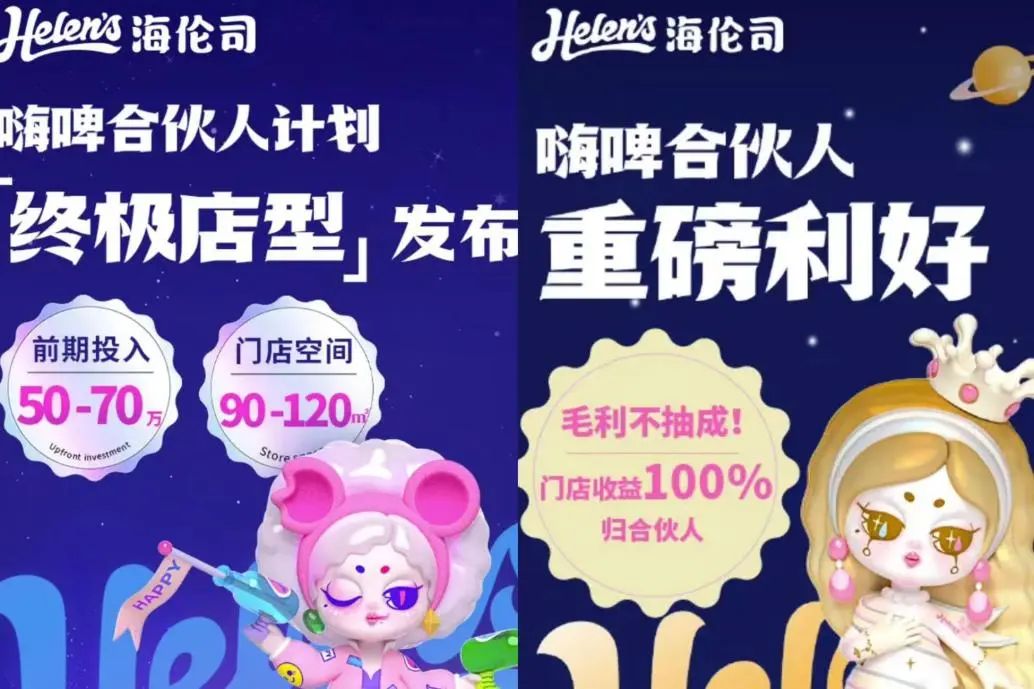為了緩解運(yùn)營壓力,2023年6月,海倫司推出“嗨皮合伙人計劃”,主打“托管合作模式”。推出投資額更低的“精品店”店型,讓合伙人擁有更多開店選擇,取消毛利抽成,把門店收益100%給到合伙人,還將已抽取的毛利全部退還。