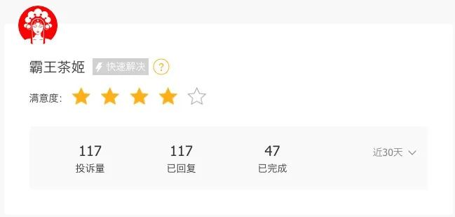 在消費者服務(wù)平臺黑貓投訴以“霸王茶姬”為關(guān)鍵詞檢索,近三十天投訴量為117條,諸多消費者投訴,霸王茶姬存在服務(wù)態(tài)度不好、喝出蟲子、口感不佳等問題。按4500家門店測算,霸王茶姬的投訴率為2.6%。