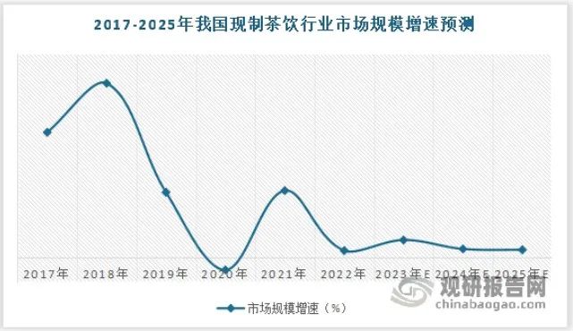 觀研天下披露的數(shù)據(jù)顯示,2016-2022年,中國現(xiàn)制茶飲行業(yè)市場規(guī)模由291億元增長至2939億元,年均復(fù)合增長率達47%。近年來,中國現(xiàn)制茶飲行業(yè)市場正逐漸觸及瓶頸,2022年-2025年的市場規(guī)模同比增速均為5%左右。