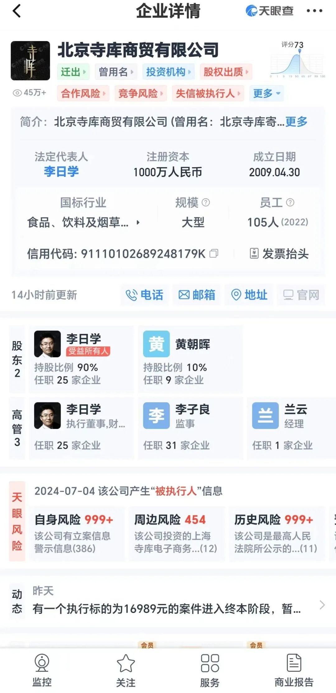 天眼查數(shù)據顯示,近年來,寺庫涉及的訴訟案件超過上百條,累計被執(zhí)行金額高達3000多萬元,公司法定代表人李日學也被列入了失信被執(zhí)行人名單,成為了大家口中的“老賴”。