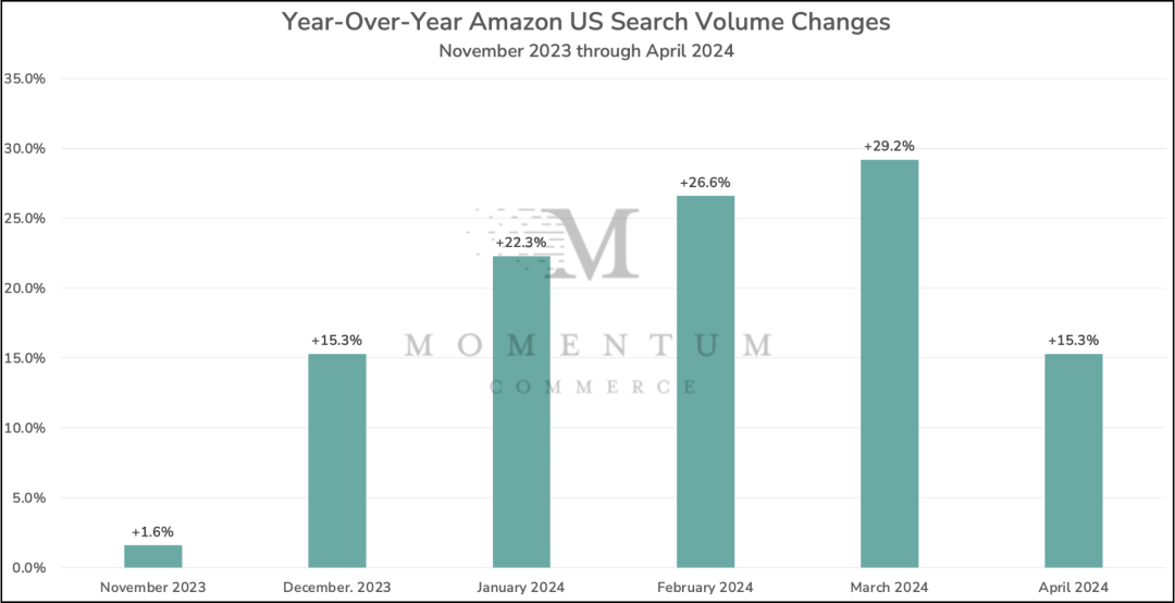 但即便采用了社交流量轉(zhuǎn)化的方式,今年以來,亞馬遜賣家的體感仍然是“流量下滑,銷量也差”。查找Momentum Commerce 2024年亞馬遜的流量數(shù)據(jù)則會發(fā)現(xiàn),盡管從去年11月起搜索流量一直在回升,但4月份15.3% 的增長率表明,亞馬遜的流量增速正再次放緩。