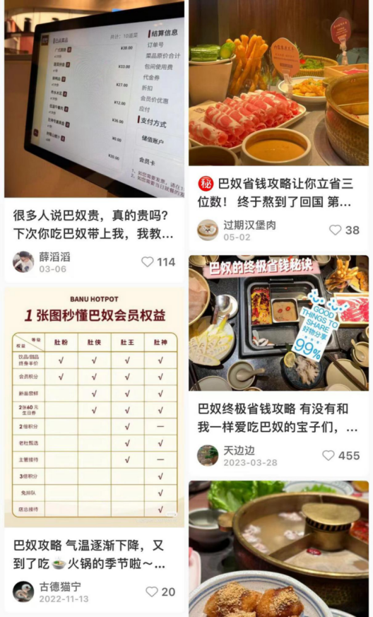 現(xiàn)在在小紅書上,可以看到大量“巴奴省錢攻略”:只要注冊了巴奴的會員,就可以用疊加各種會員“神券”和積分兌換的方式,來薅巴奴的“羊毛”。