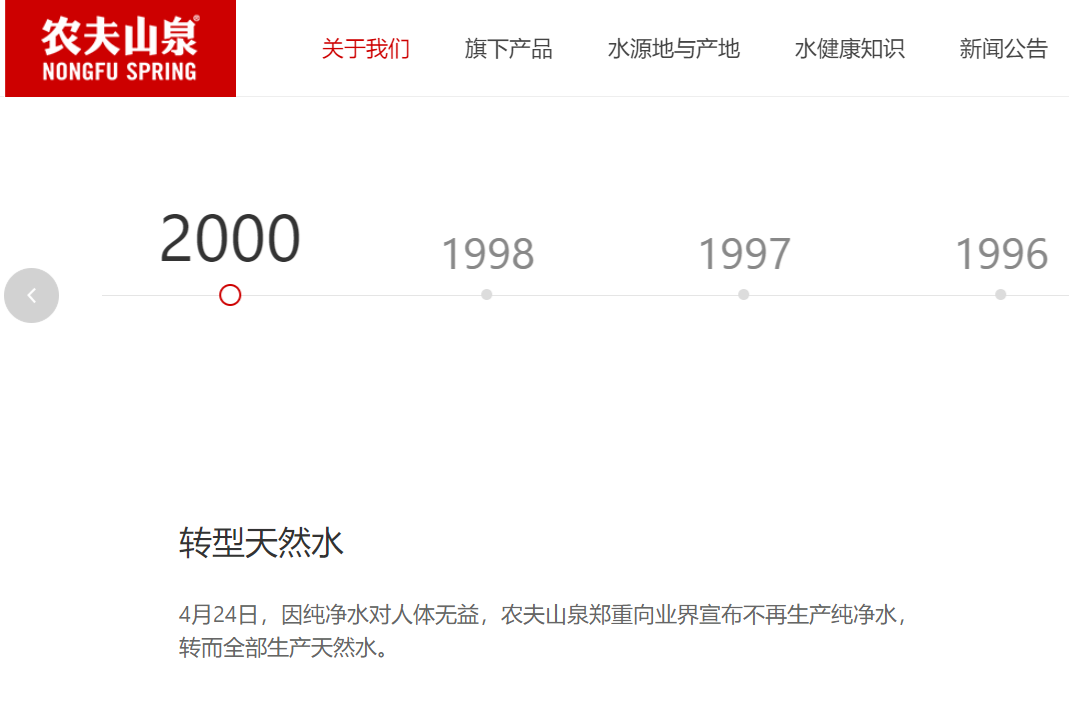 涉足瓶裝水4年后的2000年,農(nóng)夫山泉宣布轉(zhuǎn)型。至今,在公司官網(wǎng)的發(fā)展歷程中,還清楚記錄:因純凈水對人體無益,農(nóng)夫山泉鄭重向業(yè)界宣布不再生產(chǎn)純凈水,轉(zhuǎn)而全部生產(chǎn)天然水。