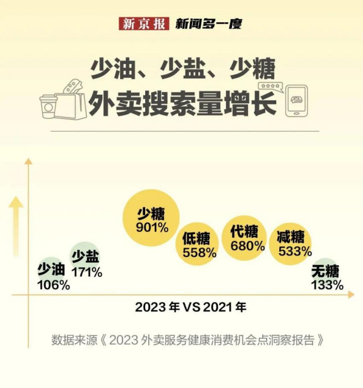 據(jù)相關統(tǒng)計數(shù)據(jù)顯示,2023年外賣平臺“少油”“少鹽”“少糖”搜索激增,尤以“少糖”飆升901%最為顯著。在社交媒體上,“控糖”筆記突破百萬篇。