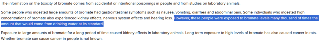 消委會文章中沒有解釋清楚的「大量」,其實(shí)就在原實(shí)驗(yàn)研究的下一句:“然而,這些人暴露于溴酸鹽的含量是飲用水標(biāo)準(zhǔn)含量的數(shù)千倍。”