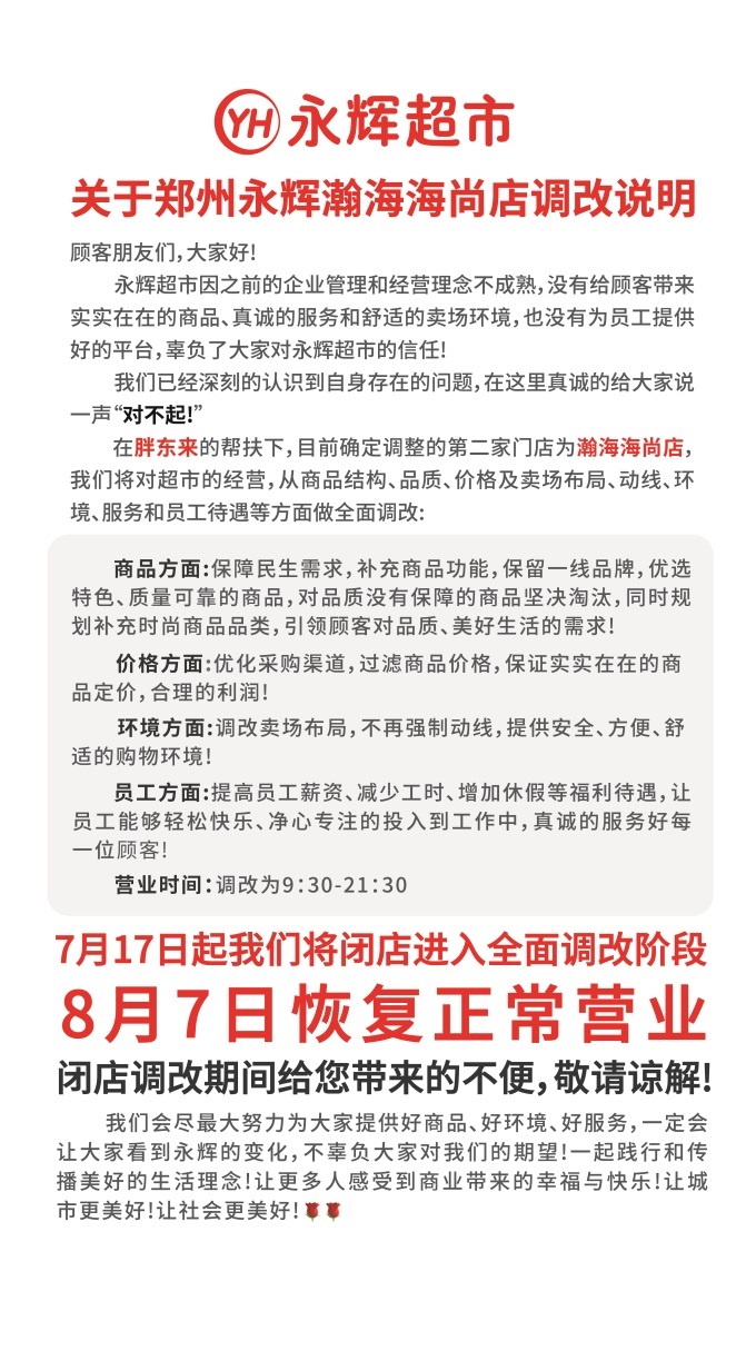 7月17日,永輝鄭州瀚海海尚店正式啟動閉店調改。這是繼永輝信萬廣場店之后,胖東來啟動調改的第二家永輝門店。據(jù)悉,門店于7月17日正式閉店進入全面調改階段,8月7日恢復正常營業(yè)。