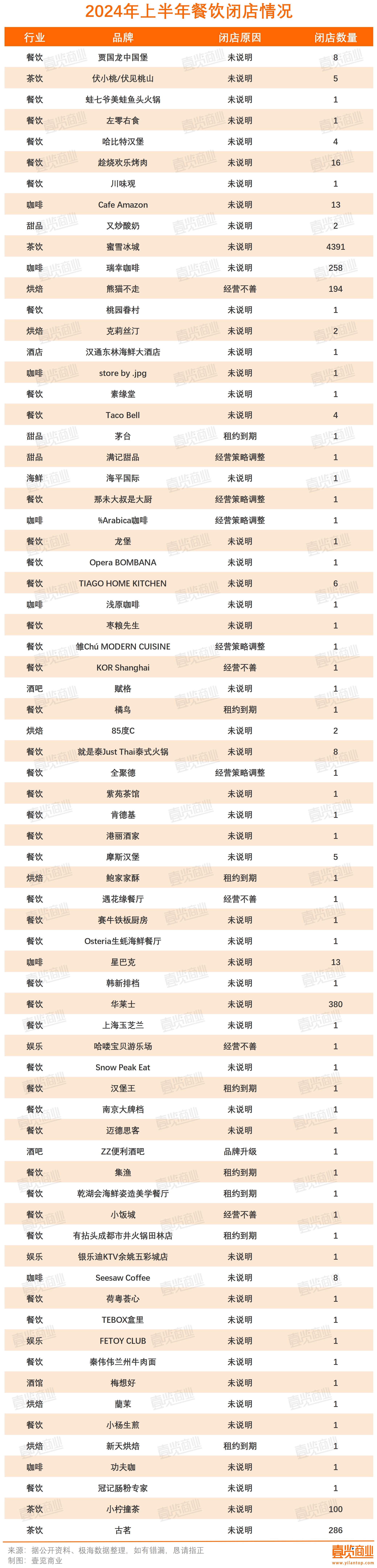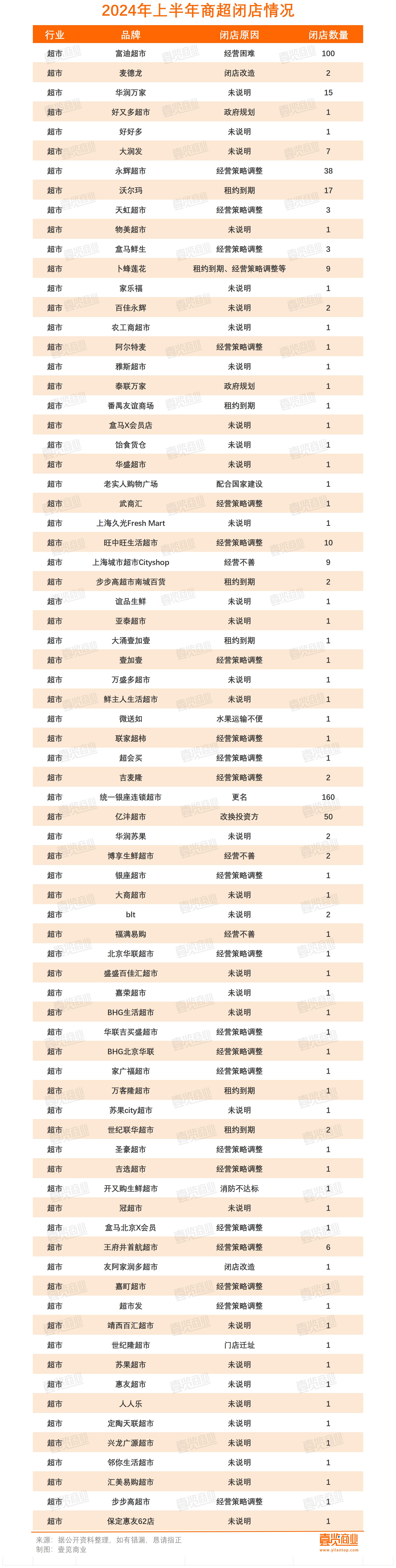 據(jù)壹覽商業(yè)不完全統(tǒng)計,2024年上半年,國內(nèi)至少有6882家門店宣布閉店,涵蓋超過100家企業(yè),其中不乏沃爾瑪、永輝超市、大潤發(fā)、盒馬等大型渠道門店,以及瑞幸咖啡、蜜雪冰城等頭部連鎖餐飲品牌。