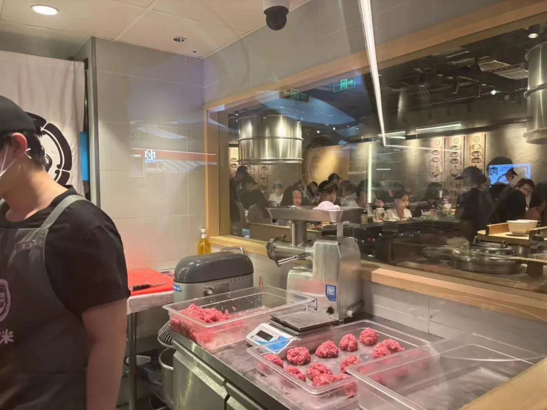 首先是用料上,雖然同樣使用牛肉,但是并未標(biāo)榜食材的來源(有店員稱是美牛,但沒有其他信息佐證)。門店設(shè)立透明的牛肉分切間,設(shè)置熟成設(shè)備,提升價值感。熟成是一種復(fù)雜且昂貴的工藝,通常用于高端牛排店和肉鋪。