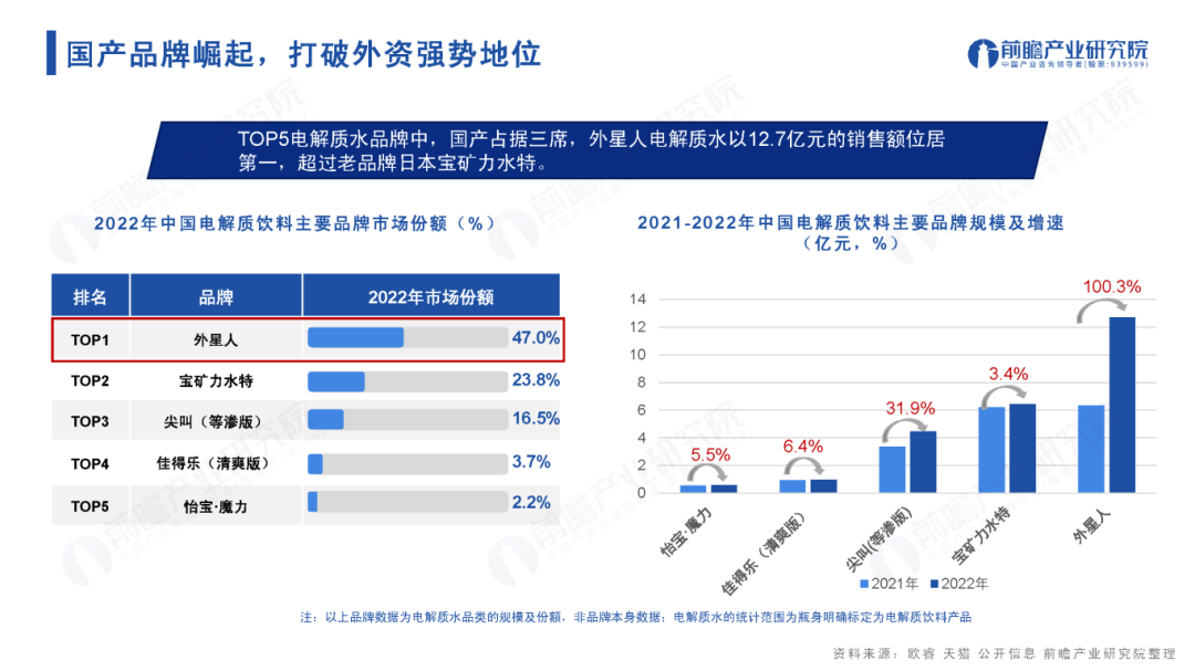 根據(jù)前瞻數(shù)據(jù)研究院《2023年中國電解質(zhì)飲料行業(yè)市場洞察報告》顯示,2022年元?dú)馍忠欢日紦?jù)了電解質(zhì)水的半壁江山,市場份額一度占據(jù)高達(dá)47%,遙遙領(lǐng)先第二名寶礦力水特的23.8%和第三名尖叫(等滲版)的16.5%。