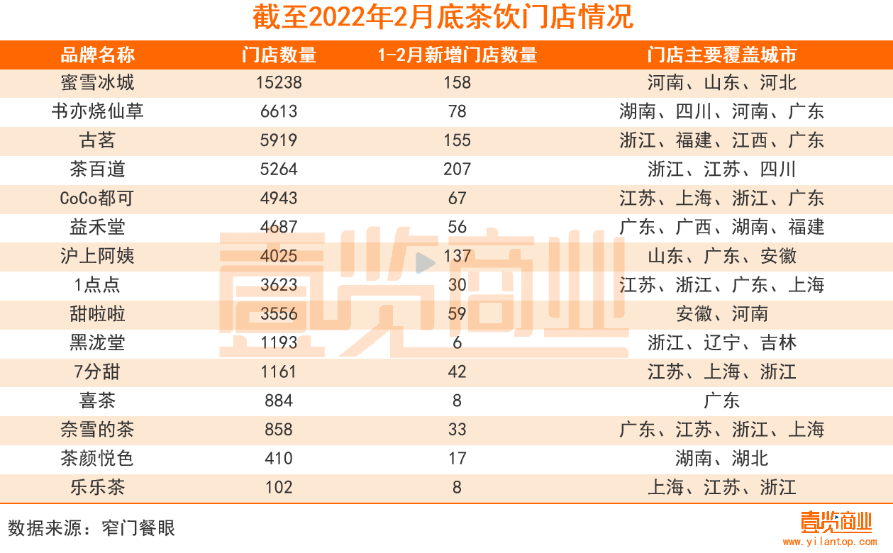 事實(shí)上,謝謝茶的消失并不讓人意外。其入局的時(shí)間,正是新茶飲賽道打得火熱之時(shí)。茶咖觀察統(tǒng)計(jì)數(shù)據(jù)顯示,截至2022年2月底,這15家茶飲品牌的門店數(shù)量合計(jì)達(dá)到58476家,其中有9個(gè)品牌門店數(shù)量都在3000以上。