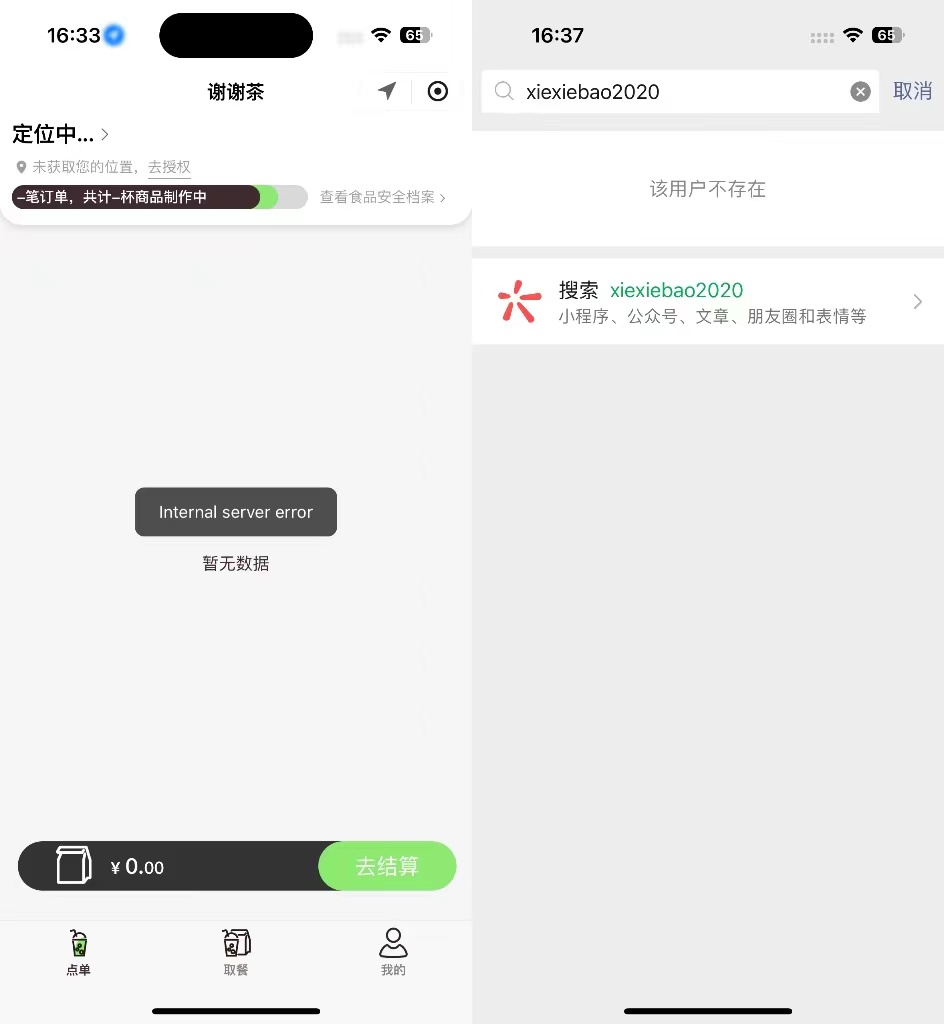 目前,茶咖觀察已經(jīng)無(wú)法搜索到謝謝茶的小程序,通過(guò)公眾號(hào)點(diǎn)進(jìn)小程序,則顯示服務(wù)器錯(cuò)誤,完全無(wú)法使用。而謝謝茶官方微博、公眾號(hào)分別自2021年4月、2022年12月起就再無(wú)更新。茶咖觀察試圖添加其公眾號(hào)公布的招商工作人員的微信,但搜索結(jié)果顯示“該用戶不存在”,多次致電謝謝茶官方,但電話未能接通。