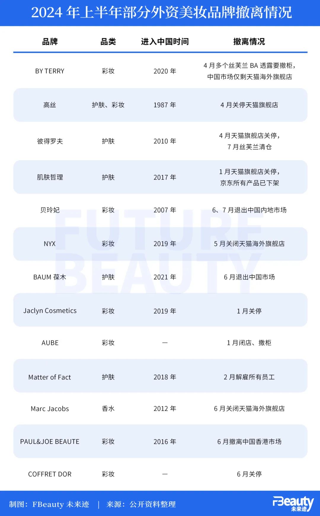 于是我又去看今年上半年外資美妝品牌在中國市場的撤離情況,還真不比國貨品牌的情況樂觀,關(guān)鍵里面還有許多背靠頭部國際集團的品牌,比如資生堂的BAUM葆木、科蒂的肌膚哲理和Marc Jacobs、歐萊雅的NYX、LVMH的貝玲妃等等。
