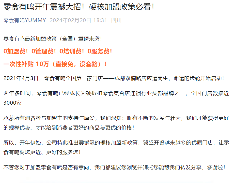 事實(shí)上,量販零食的“規(guī)模之戰(zhàn)”早已開打,門店數(shù)量僅次于鳴鳴很忙的好想來,推出了減免加盟費(fèi)、管理費(fèi)、服務(wù)費(fèi)、配送費(fèi)及補(bǔ)貼活動,愛零食也宣布下半年的加盟政策涉及巨額補(bǔ)貼,零食有鳴則直接宣布0加盟費(fèi)、0管理費(fèi)、0培訓(xùn)費(fèi)、0服務(wù)費(fèi),同時(shí)一次性補(bǔ)貼10萬元。