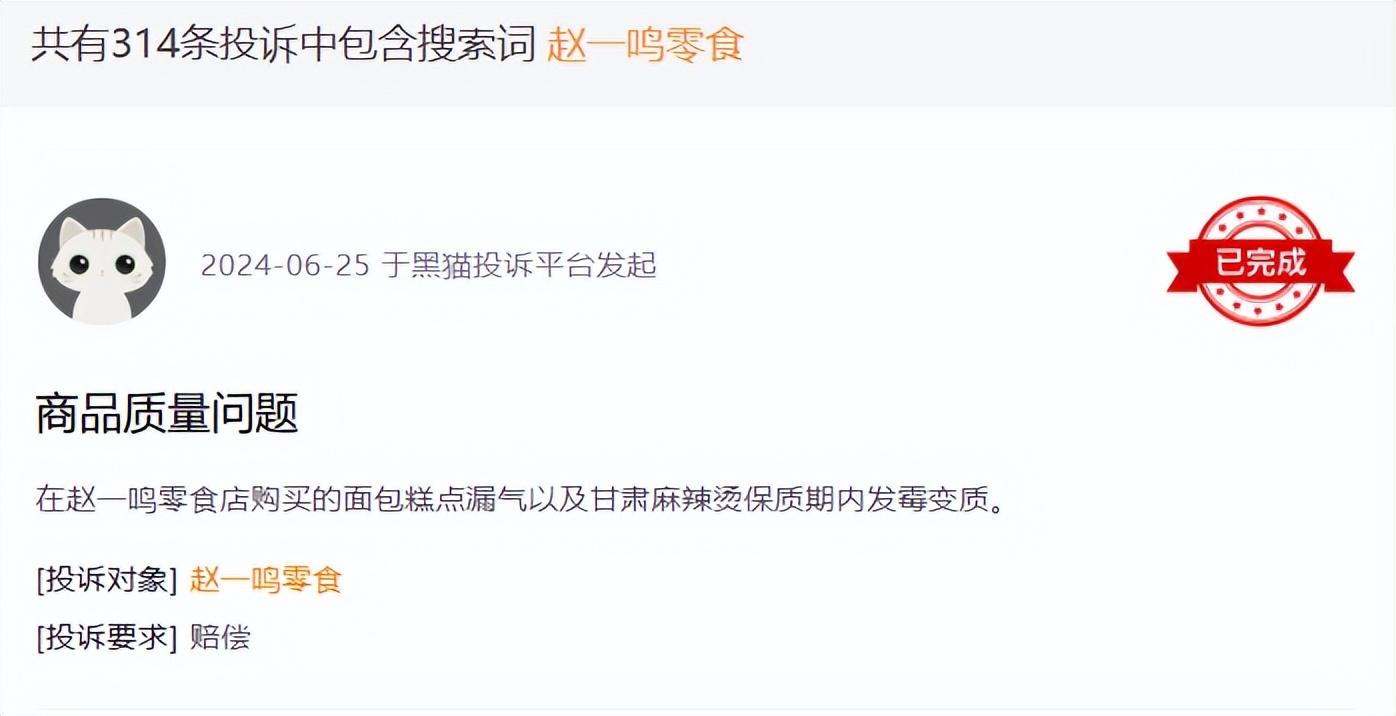 黑貓投訴平臺上,多位消費(fèi)者投訴在零食很忙的零食中吃到了蟲子、橡皮筋等異物,還有不少消費(fèi)者買到了變質(zhì)發(fā)霉的鴨腿、鴨脖、面包等。趙一鳴零食也出現(xiàn)過同樣的問題,黑貓投訴平臺上,趙一鳴零食相關(guān)的投訴超過300條。除了一些是因?yàn)榉⻊?wù)態(tài)度,大部分都與食品安全問題有關(guān)。小紅書上,也有多條曝光趙一鳴零食存在食品安全問題的帖子。