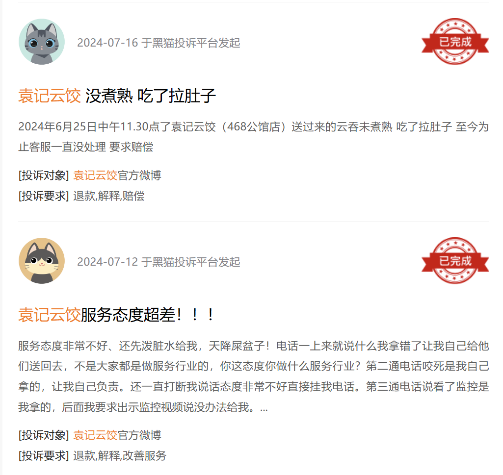 在黑貓投訴平臺(tái),以及小紅書(shū)、大眾點(diǎn)評(píng)等社交平臺(tái)上,有大量關(guān)于袁記云餃的投訴。相關(guān)的投訴內(nèi)容主要集中在2個(gè)方面,一個(gè)是產(chǎn)品問(wèn)題,一個(gè)是服務(wù)態(tài)度差。