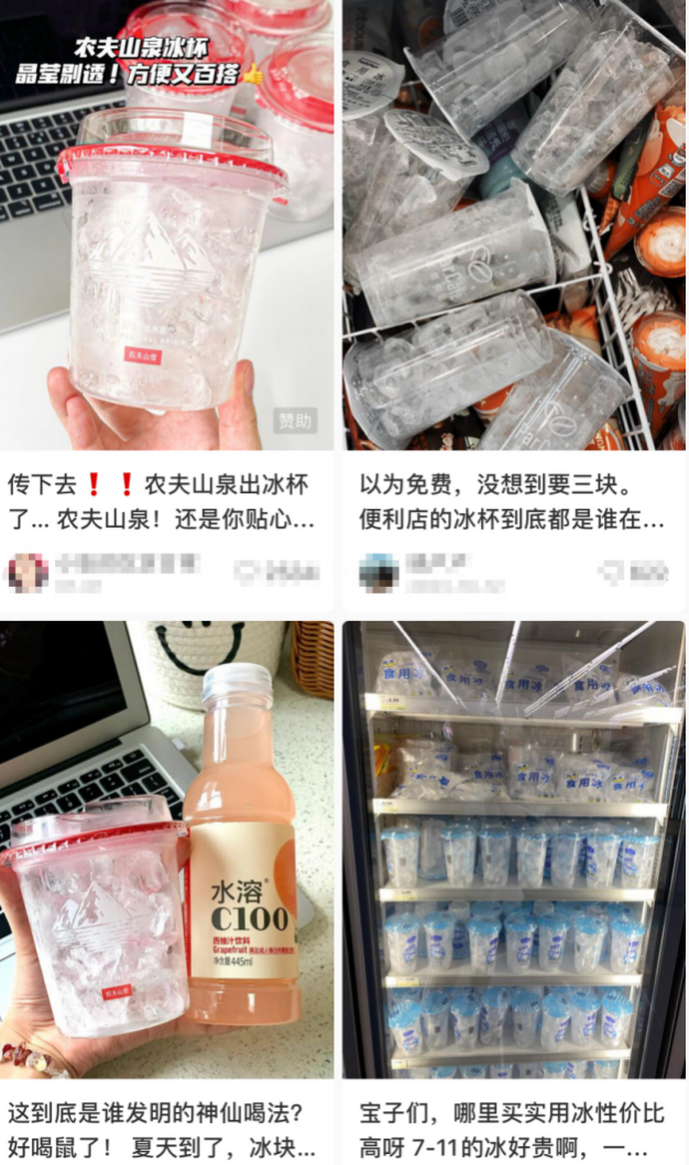 今年2月,小紅書上陸續(xù)出現(xiàn)用農(nóng)夫山泉冰杯的DIY攻略,5月各地便利店已經(jīng)能發(fā)現(xiàn)農(nóng)夫山泉冰杯的身影。直到7月,“雪王”蜜雪冰城推出1元冰杯,直接將冰杯熱度推到了至高點。