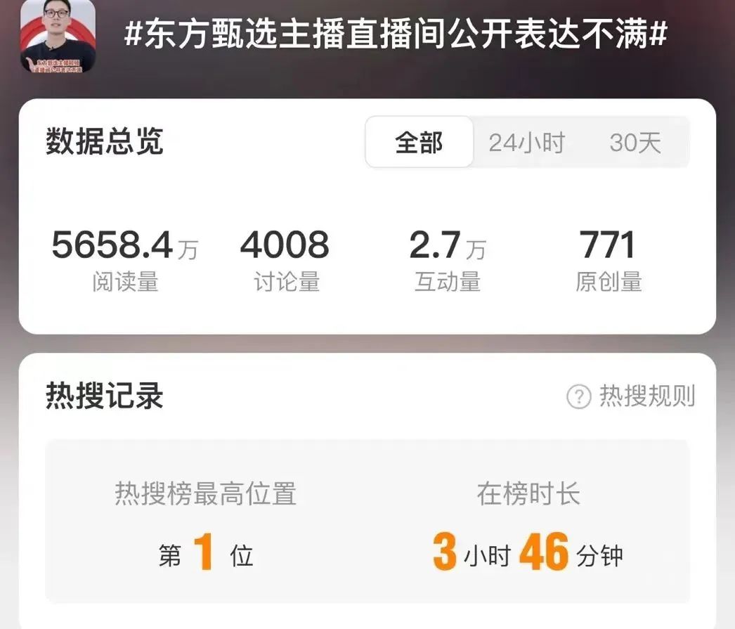 頓頓心里一半是不服氣,一半是有怨言。叫賣(mài)事件過(guò)后,頓頓又在東方甄選直播間吐槽公司,稱對(duì)公司有一點(diǎn)失望,因?yàn)楣鹃_(kāi)新賬號(hào)不和主播商量、面對(duì)負(fù)面輿論不作為等。盡管頓頓稱“說(shuō)出來(lái)也就結(jié)束了”,可是此舉直接沖到了熱搜第一。