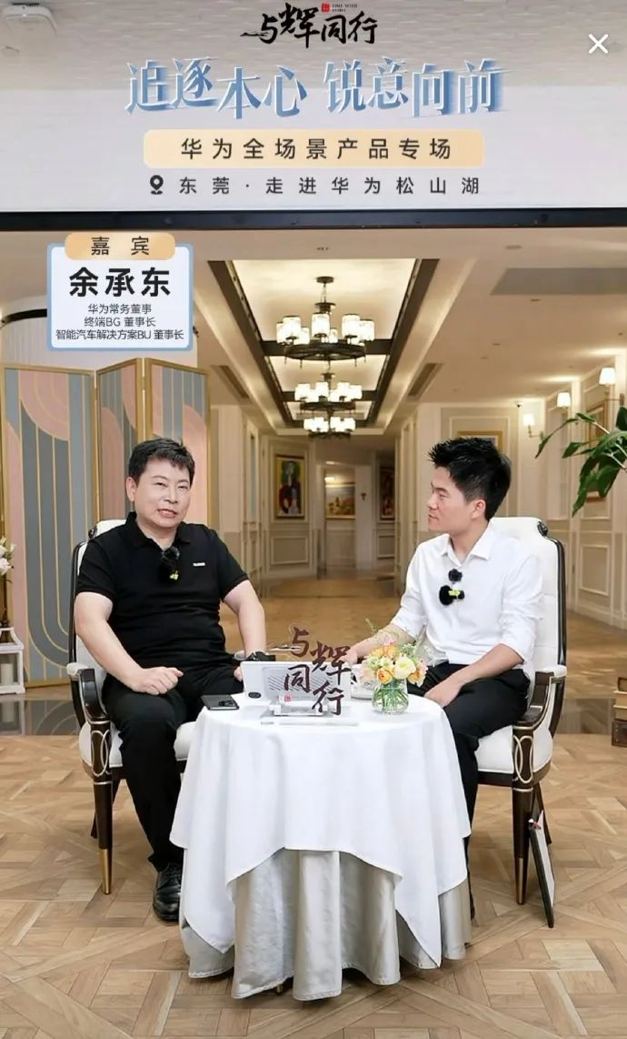 7月15日,董宇輝與華為常務(wù)董事、終端BG董事長(zhǎng)、智能汽車(chē)解決方案BU董事長(zhǎng)余承東做了一期訪談?lì)惞?jié)目,兩人一邊在東莞松山湖旁閑庭信步,一邊來(lái)了一場(chǎng)深度對(duì)話。