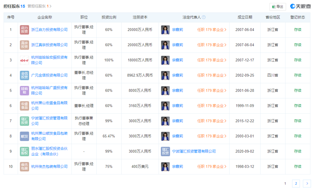 天眼查顯示,宗馥莉如今在179家企業(yè)任職,其中擔(dān)任法人代表的有37家,持股超過(guò)60%的企業(yè)就有14家,包括持股100%的杭州娃哈哈宏振投資有限公司,持股60%的浙江啟力投資有限公司,持股60%的杭州順發(fā)包裝有限公司等。