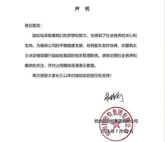 7月22日晚間,據(jù)娃哈哈集團(tuán)官網(wǎng)發(fā)布聲明稱,為確保公司平穩(wěn)健康發(fā)展,經(jīng)各股東友好協(xié)商,宗馥莉決定繼續(xù)履行娃哈哈集團(tuán)的相關(guān)管理職責(zé)。聲明落款仍是宗馥莉。