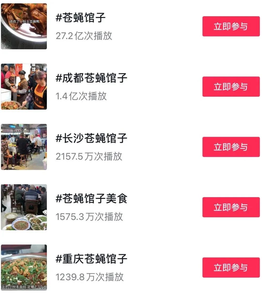 截至2024年7月23日,抖音上,#蒼蠅館子相關(guān)視頻播放次數(shù)高達(dá)27.2億次,熱門旅游城市的蒼蠅館子受到了更多關(guān)注,比如成都蒼蠅館子相關(guān)視頻播放次數(shù)為1.4億次,長(zhǎng)沙和重慶蒼蠅館子的播放次數(shù)也超過千萬(wàn)。