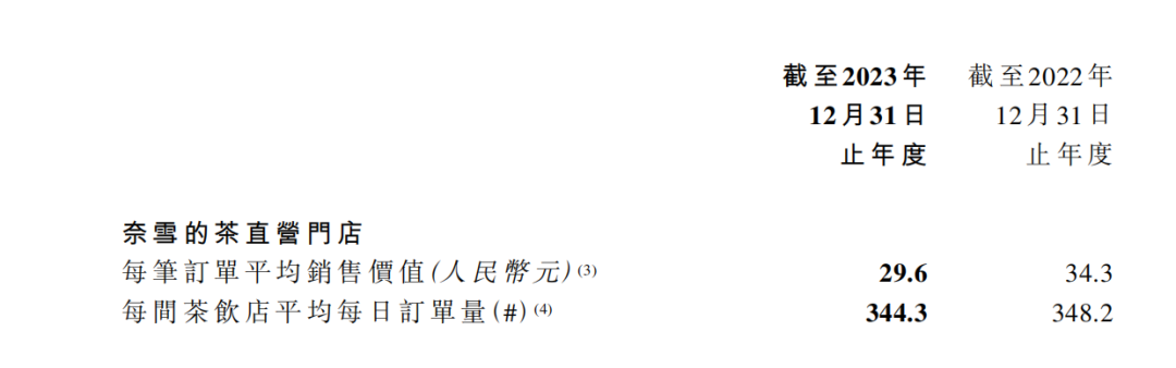 2023年,奈雪每間茶飲店平均每日訂單量為344.3,相比上年同期的348.2下降了1.12%,再對(duì)比直營(yíng)門(mén)店每筆訂單平均銷(xiāo)售價(jià)值的數(shù)據(jù),可謂是量?jī)r(jià)齊跌。