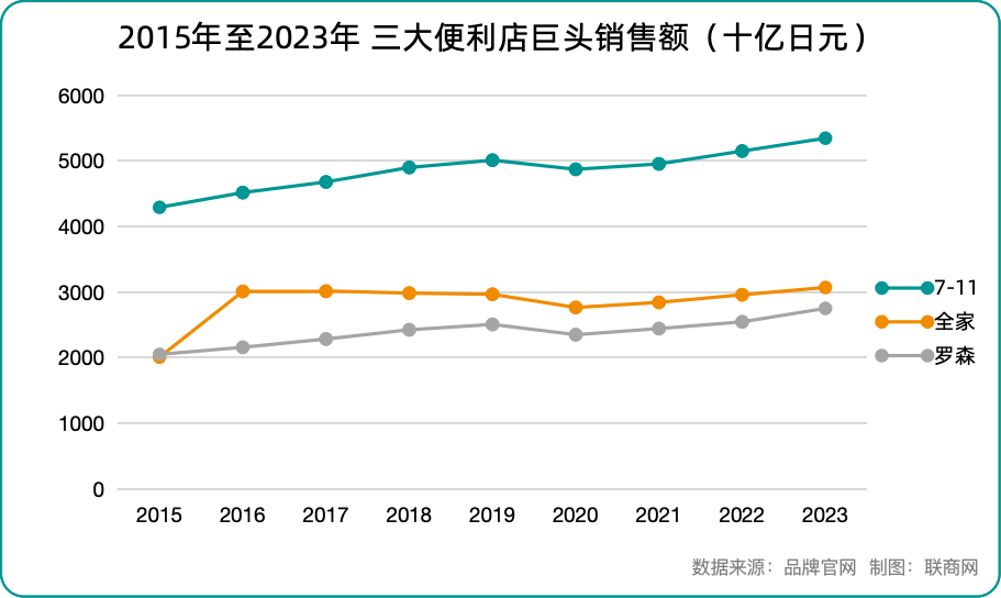 事實(shí)上,三菱商事曾公開(kāi)透露,其擔(dān)憂(yōu)羅森需要額外的支持。這種擔(dān)憂(yōu)來(lái)源于,羅森雖然是日本三大便利店之一,但其作為第三名的定位已經(jīng)根深蒂固,難以逆轉(zhuǎn)。從年銷(xiāo)售額的變化走勢(shì)來(lái)看,很明顯,7-11正在逐漸拉開(kāi)與全家和羅森之間的差距。