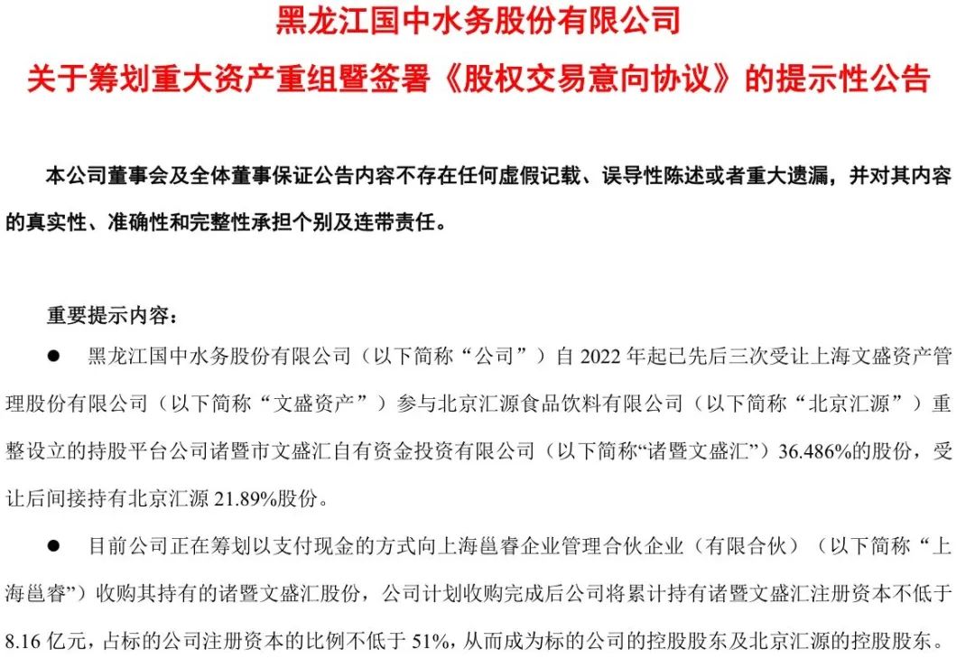 國中水務(wù)發(fā)布的公告稱,國中水務(wù)擬以支付現(xiàn)金的方式,收購上海邕睿持有的諸暨文盛匯不低于23222.4萬元注冊資本,收購?fù)瓿珊蠊緦⒗塾嫵钟兄T暨文盛匯注冊資本不低于8.16億元,占標(biāo)的公司注冊資本的比例不低于51%,從而成為諸暨文盛匯的控股股東及匯源果汁的控股股東。