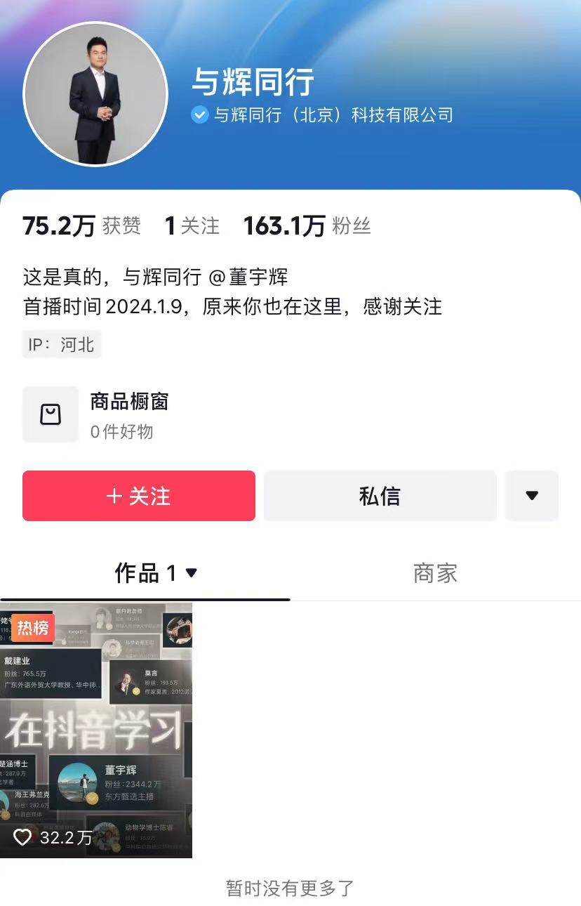 2023年12月,“小作文事件”引發(fā)東方甄選輿論事件,董宇輝升級成為“東方甄選高級合伙人”,并成立個人工作室,12月26日,董宇輝在抖音開通新賬號“與輝同行”,開啟“單飛”。企查查APP顯示,與輝同行(北京)科技有限公司成立于2023年12月,注冊資本為1000萬人民幣。公司法定代表人、執(zhí)行董事以及經(jīng)理均為董宇輝,而監(jiān)事則由俞敏洪擔任。此外,公司全資持股方為北京新東方迅程網(wǎng)絡(luò)科技有限公司。
