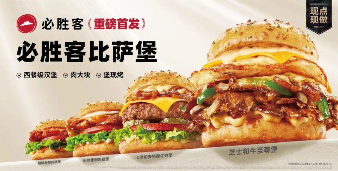 早在4月份,必勝客就在全國2000家門店上新了“比薩堡”,西餐級大塊肉搭配必勝客獨有的“比薩面包”,現(xiàn)點現(xiàn)烤,19.9元起,最頂級的芝士和牛至尊堡只要32元。