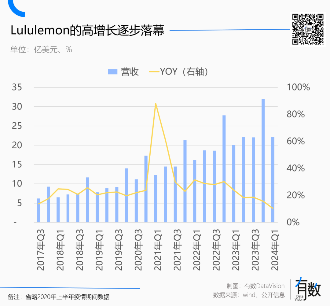 曾經(jīng),憑借前赴后繼的“super girls”貢獻(xiàn)訂單,Lululemon上演了一場(chǎng)業(yè)績(jī)?cè)鲩L(zhǎng)神話:扣除2020年疫情關(guān)店影響,自2018年起,其收入同比增速連續(xù)19個(gè)季度保持在20%以上[4]。