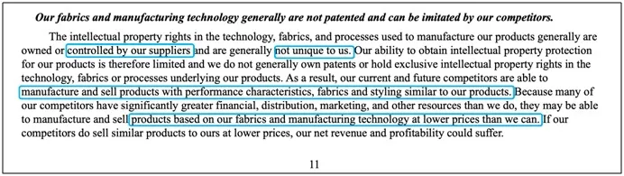 這種非獨(dú)占模式,讓Lululemon時(shí)刻處于風(fēng)險(xiǎn)叢林當(dāng)中,儒鴻可以把面料賣給Lululemon,也可以賣給別人。
