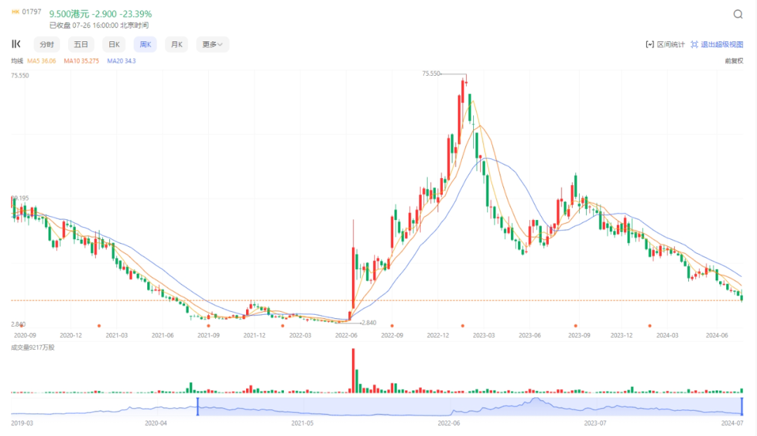 二級市場上,東方甄選的股價從2022年6月開始暴漲,一路從3.7港元/股暴漲到最高的75.7港元/股,市值直接翻了20多倍;到了2023年,東方甄選股價開始回彈,一直到去年底“小作文事件”之后,股價開始呈現(xiàn)強下滑趨勢。