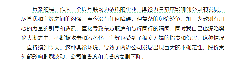 俞敏洪提到“被網(wǎng)友定義為“小作文事件”的突然爆發(fā),讓人措手不及,暴露出了諸多問題,我和宇輝陷入了尷尬的境地,公司也陷入了動蕩之中。”