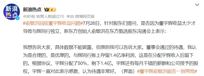 當提到董宇輝的離開是不是因為待遇不夠的時候,俞敏洪解釋道,到現(xiàn)在“與輝同行”賬上還趴著1.4億元的利潤,這個利潤是在董宇輝已經(jīng)拿走了全部利潤50%之后的結(jié)果,換句話說董宇輝個人已經(jīng)拿走了1.4億元的獎勵;此外,這原本應該100%屬于東方甄選的1.4億元利潤被贈予與輝同行,其主要的原因除了表達對董宇輝以及對社會的善意之外,還有就是董宇輝原本也有股權激勵,但是由于他不再任職這部分股權激勵也將終止,所以相當于這部分錢折現(xiàn)了。