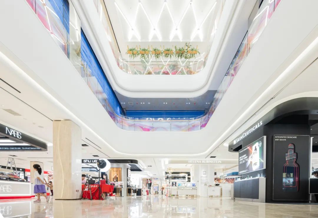 在空間打造上,依托泉荷聯(lián)動(dòng)的設(shè)計(jì)靈感,銀座商城空間層層遞進(jìn),極簡(jiǎn)的線條和抽象的文化表達(dá),營(yíng)造出獨(dú)特的文化藝術(shù)氛圍。