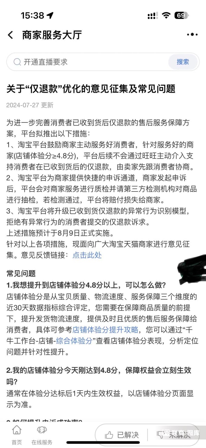 聯(lián)商快訊:7月26日,淘寶宣布將優(yōu)化“僅退款”策略,依據(jù)新版體驗分提升商家售后自主權(quán),對優(yōu)質(zhì)店鋪減少或取消售后干預。相關(guān)策略將于8月9日正式實施。