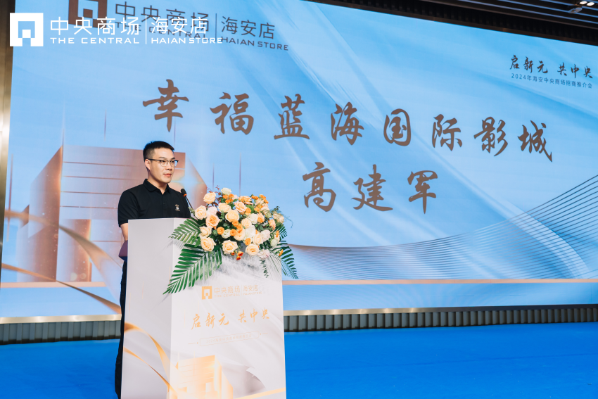 幸福藍(lán)海影城總經(jīng)理高建軍先生作為商戶代表上臺致辭,高總表示在如今激烈的競爭市場中,幸福藍(lán)海影城之所以選擇從淮安來到海安,是因為海安商業(yè)的未來具有無限可能。幸福藍(lán)海影城將于8月進(jìn)場施工,高總表示,期待為海安人民帶來一個全新的、不一樣的影院項目,未來將與中央商場攜手,共同煥新海安商業(yè)格局,與城市共生共榮。