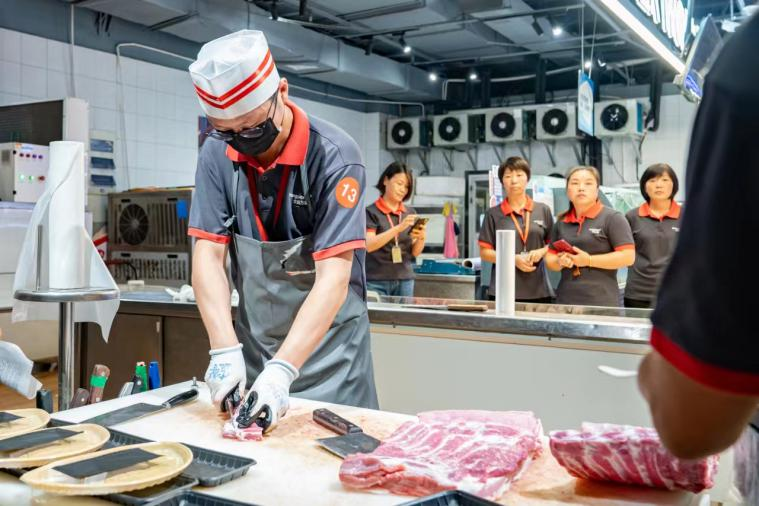 在生鮮技能比賽中,選手們熟練進行豬肉分割、果切分割、烤燒、鹵水、小炒、涼拌菜、壽司拼盤、水果沙拉、烘焙面包、中式面點及蛋糕。選手們精心備戰(zhàn),沉著應(yīng)戰(zhàn),將技能發(fā)揮發(fā)揮到最佳水準(zhǔn),給顧客和評委們呈現(xiàn)了一場“色香味”俱全的美食盛宴。在豬肉分割比賽中,生鮮師傅手起刀落,“刀”走龍蛇,做到精準(zhǔn)分割,肥瘦均勻、克重一致,令人嘆為觀止。在中式面點制比賽中,經(jīng)過面點師精心構(gòu)思的面點成品,造型栩栩如生,展示了精巧的心思和精湛的手法。