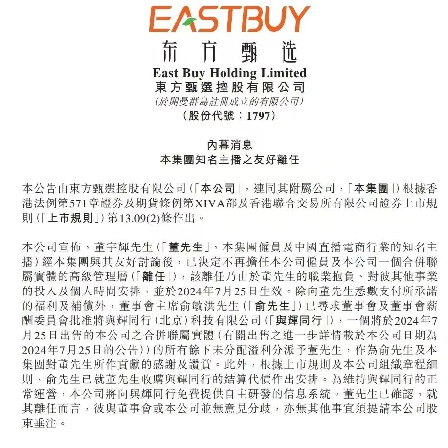 隨后俞敏洪發(fā)布《致東方甄選股東朋友的一封公開信》進(jìn)行詳細(xì)說明,并表示:宇輝購買公司的錢我安排了,公司是送給宇輝的。董宇輝也發(fā)表長文《給所有朋友的一封信》,表示經(jīng)過雙方友好協(xié)商和一致決定,與輝同行之后將獨(dú)立運(yùn)行,并感謝了俞敏洪和東方甄選的支持 。